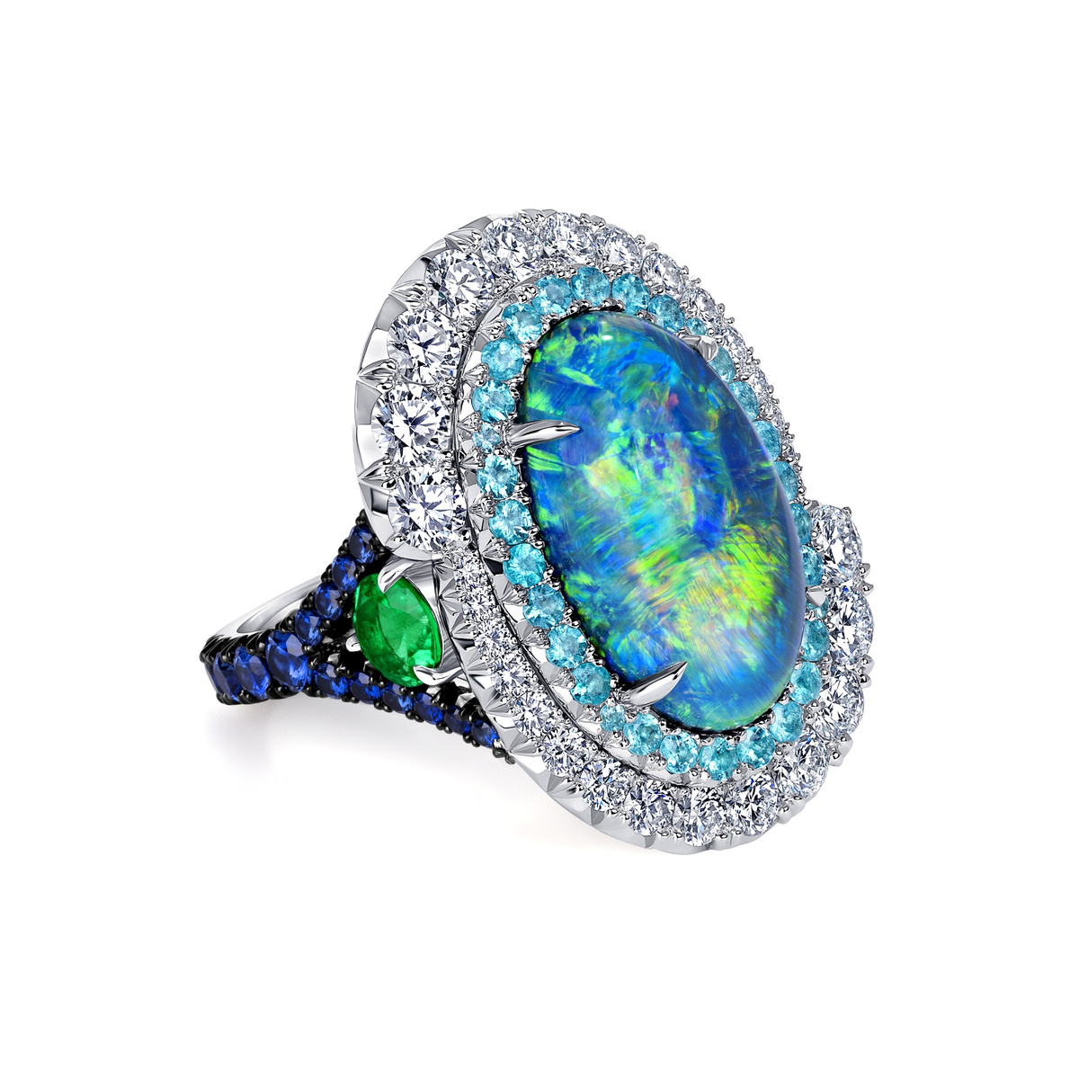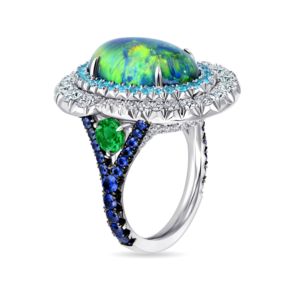OV CAB Natural Black Opal 8.83ct (Australia - Lightning Ridge) - GIA 2 RD Colombian Emeralds 0.62ctw - Oiled RB 1.53ct, Paraibas 0.44ct & SA 0.80ct Made in Platinum This jewel has sold.